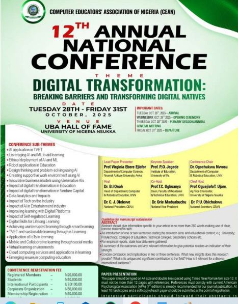 Dr. Olelewe 2025-06-30 By ADMIN 12th Annual National Conference of Computer Educators Association of Nigeria (CEAN) ... 2024-05-16 By ADMIN Newsflash CEAN Conference Flyers ... CEAN Conference Flyers 2024-05-16 By ADMIN Newsflash CEAN Conference Flyers Newsflash...